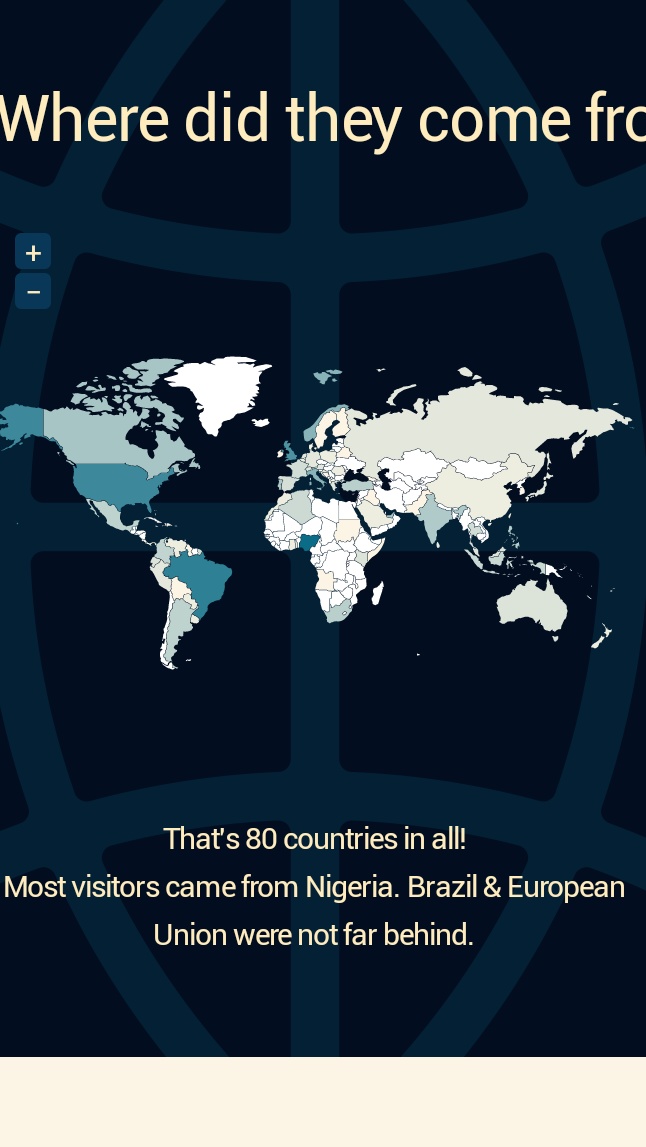 However, the stats wasn’t all shades of bad. The item on the stat that got me most excited was that the blog was accessed in more countries of the world this year than ever before – 80 countries!